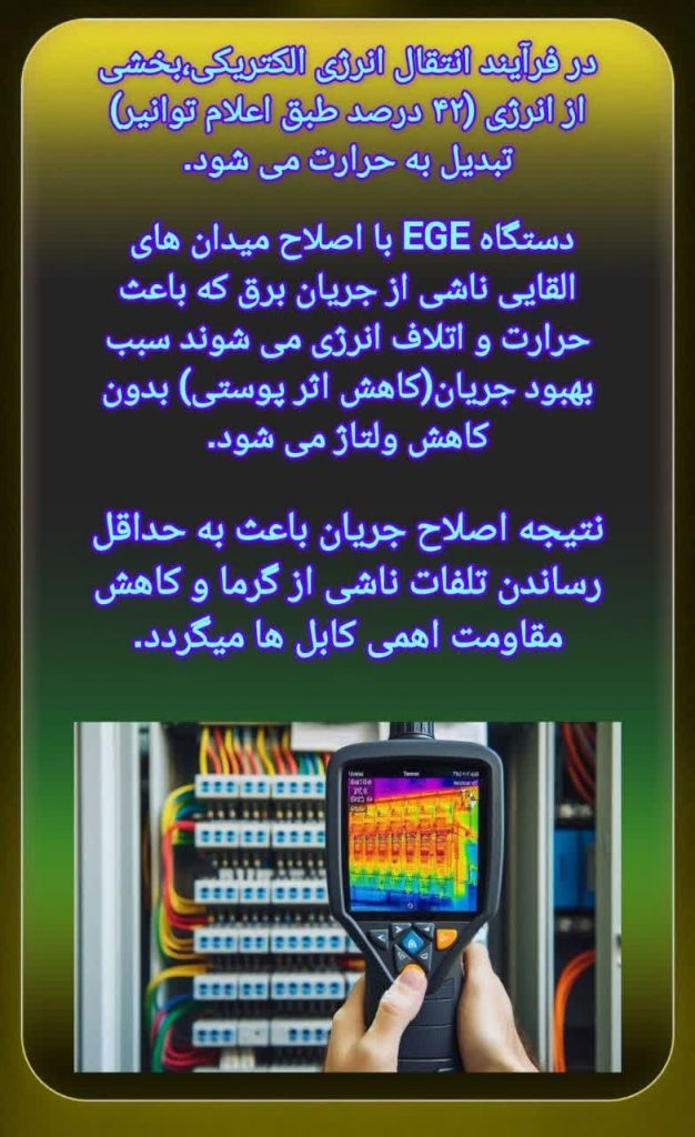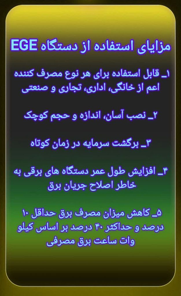 دستگاه EGE نخستین صرفه جویی کننده جهانی است که سیستم بهبود جریان را از طریق کمینه کردن بارها، کاهش تلفات حرارتی و بدون کاهش ولتاژ به کار می گیرد که نتیجه عالی و مؤثر جهت کاهش هزینه مصرف برق خانگی، تجاری، اداری و صنعتی را به همراه دارد.