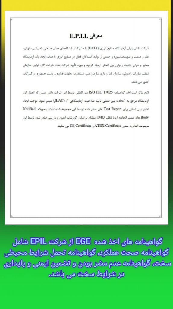 گواهینامه تست شرایط محیطی مطابق با استانداردهای بین المللی IEC 60068-2 از شرکت آزمایشگاه (EPIL)