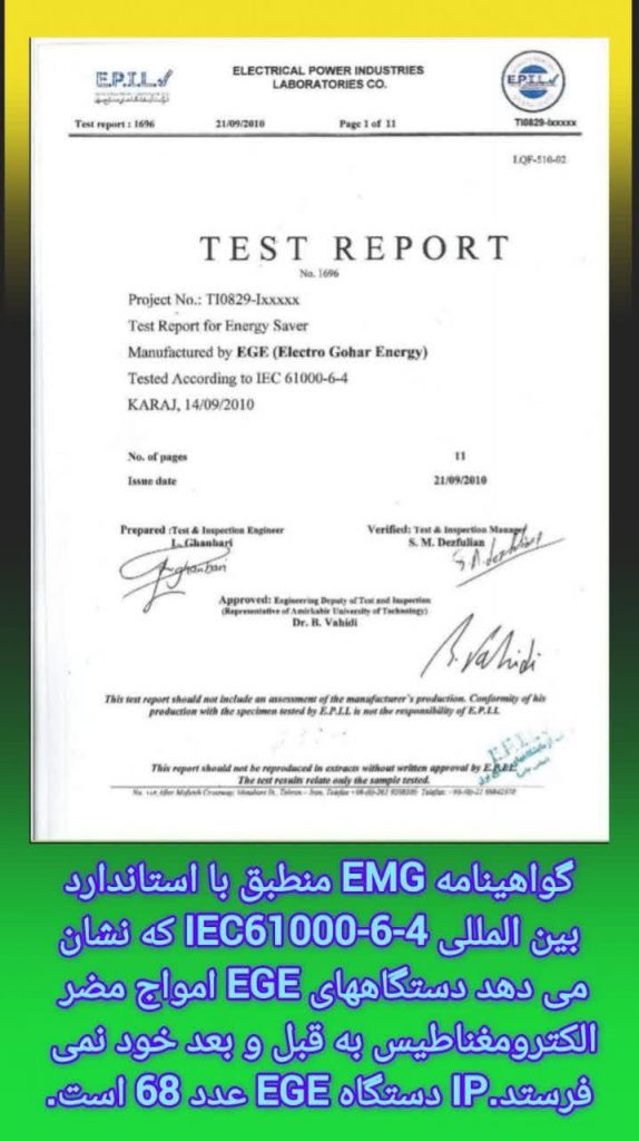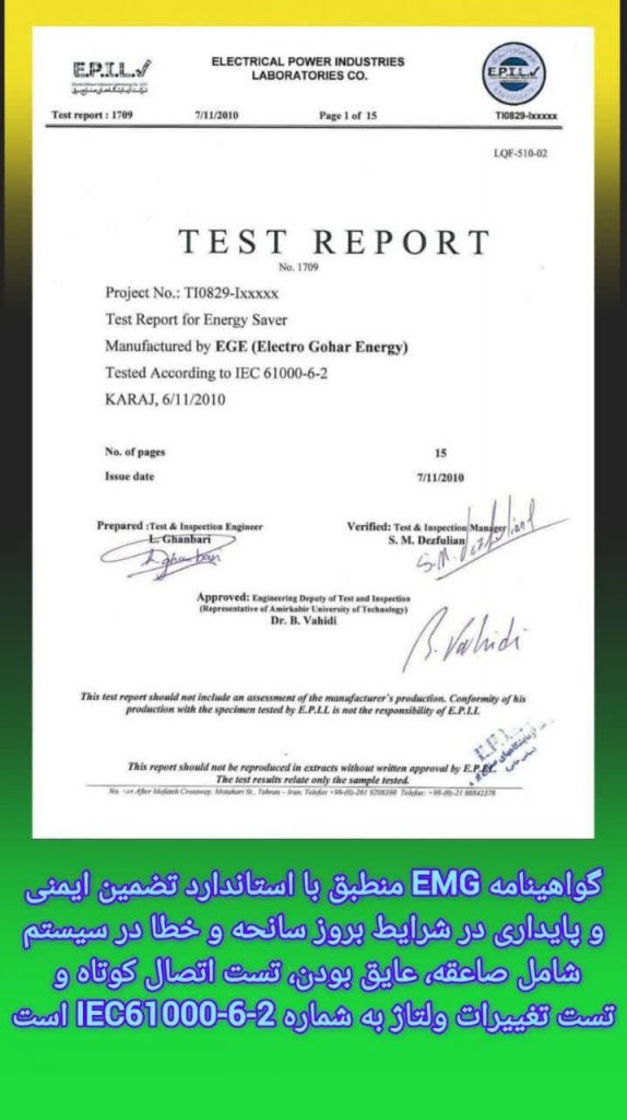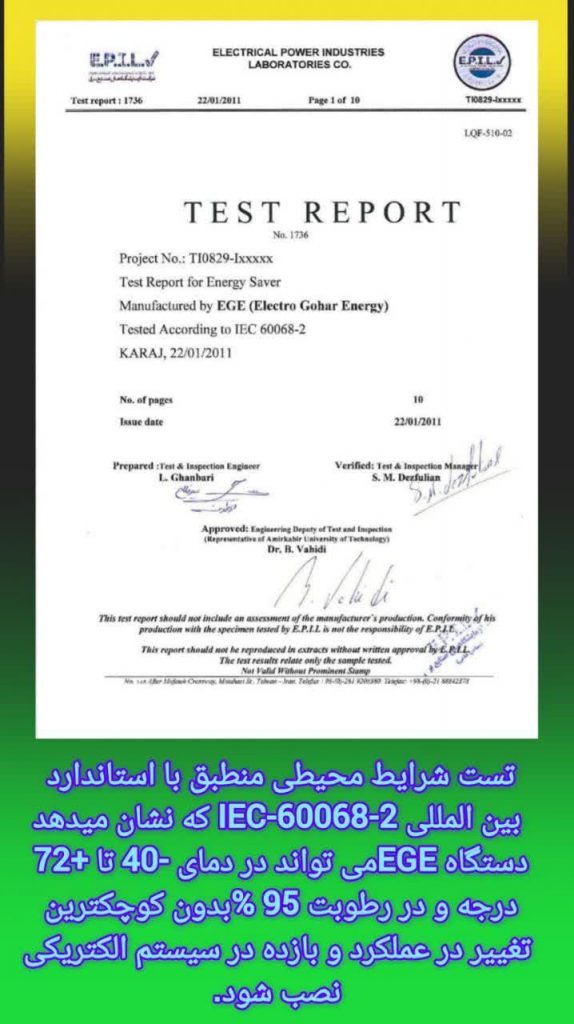 گواهینامه آزمایشگاه صنایع برق (EPIL) برای صحت عملکرد دستگاه کاهش مصرف برق EGE