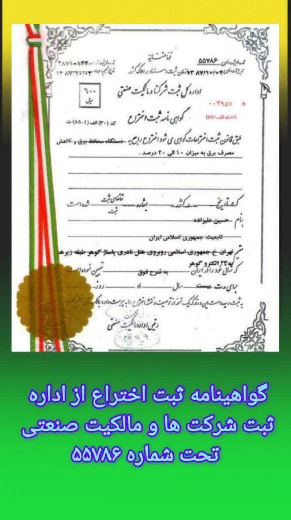 گواهینامه ثبت اختراع از اداره ثبت شرکت ها و مالکیت صنعتی تحت شماره ۵۵۷۸۶